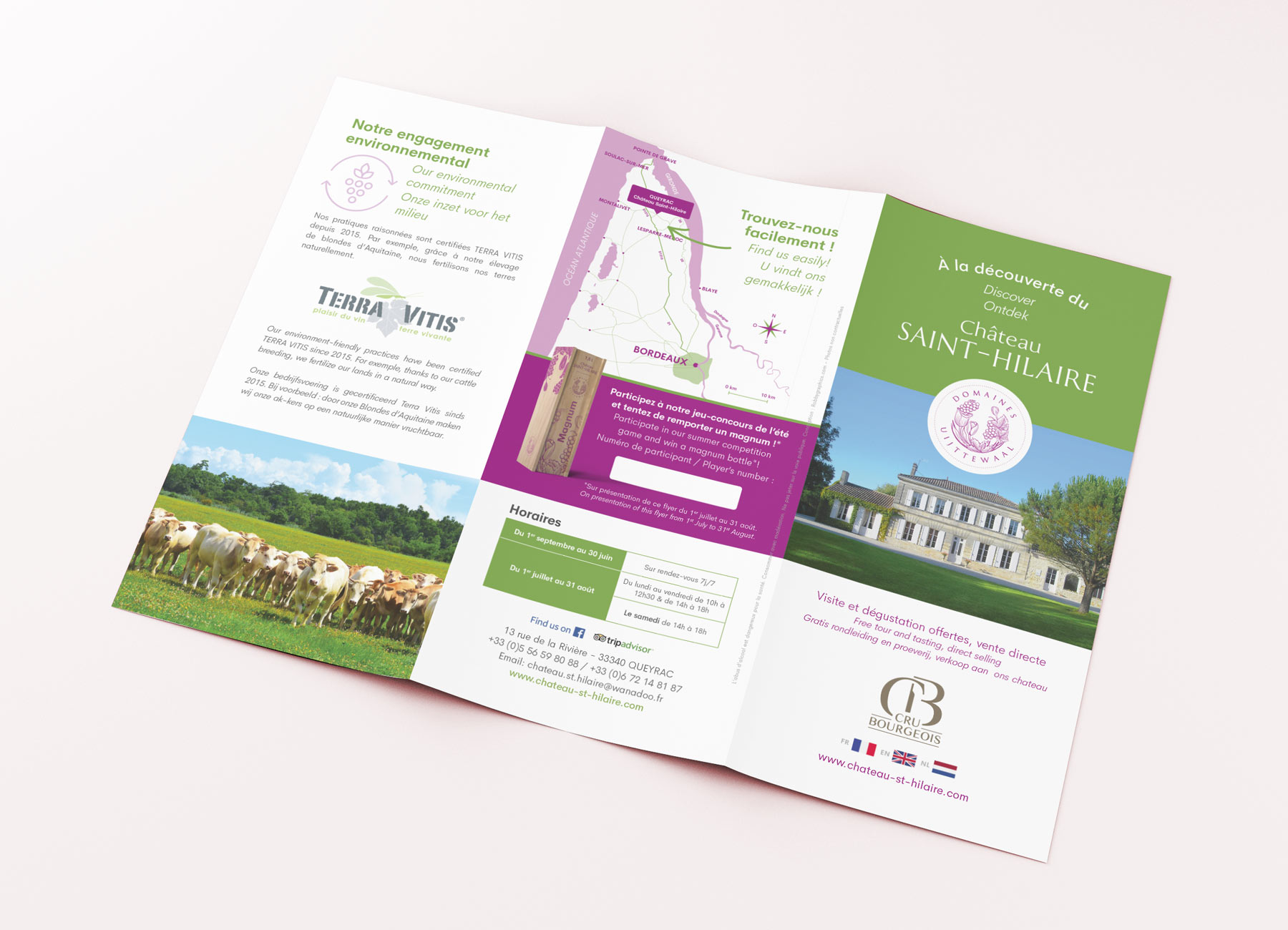 En 1995, après dix récoltes livrées en cave coopérative, Adrien Uijttewaal construit ses chais à Queyrac. Au fil des millésimes, le domaine se développe pour atteindre 60 ha de vignes AOC Médoc et élever 180 Blondes d’Aquitaine. C'est sa fille Elise que j'ai rencontré au salon Vinitech à Bordeaux. Son besoin : créer une identité pérenne pour l'entreprise familiale. Il s'agissait alors de réaliser un logo. Après ce travail, réalisé en complète coordination avec Elise, nous nous sommes penchés sur un dépliant 3 volets afin de promouvoir le domaine du Château Saint-Hilaire.